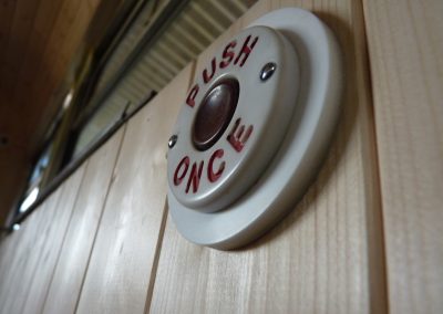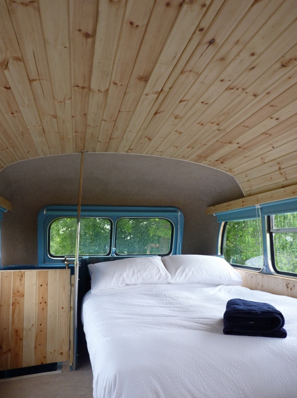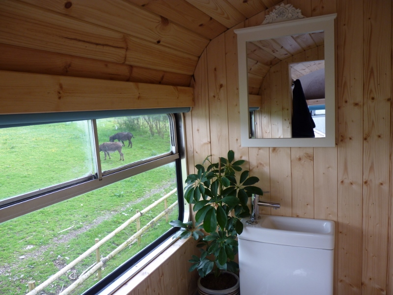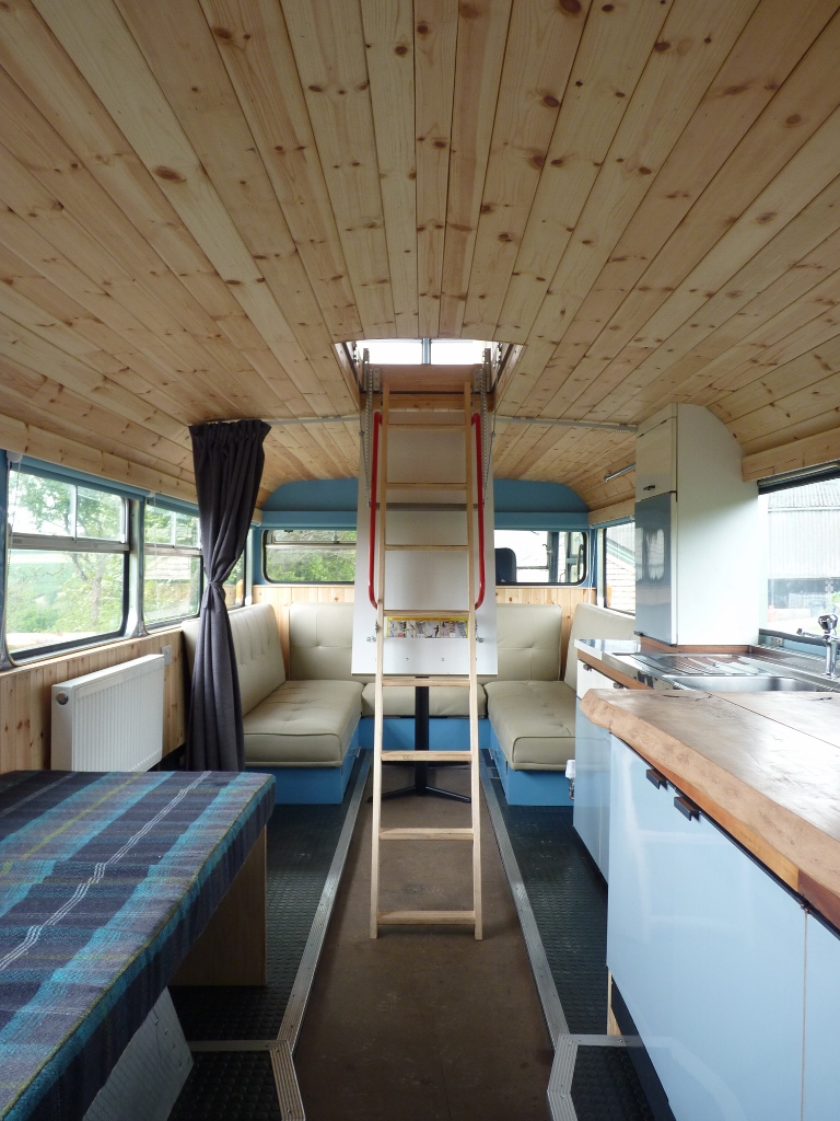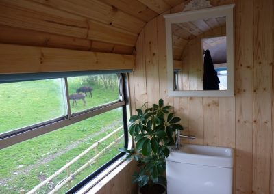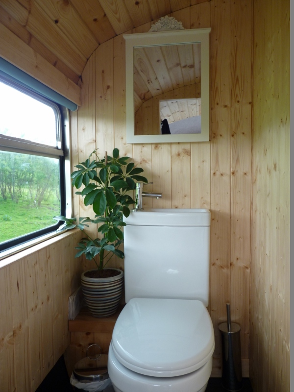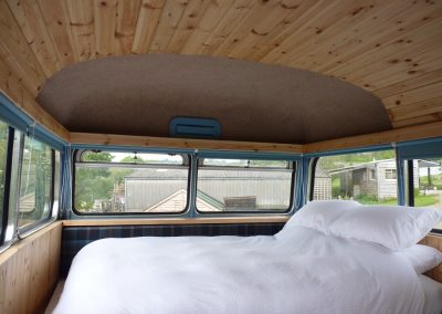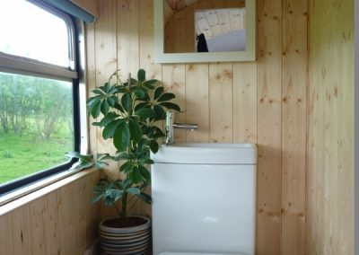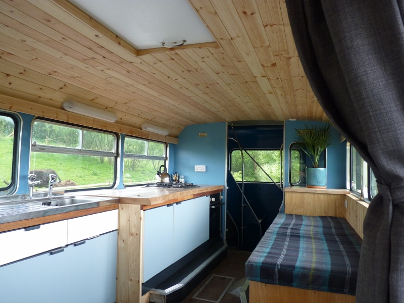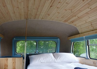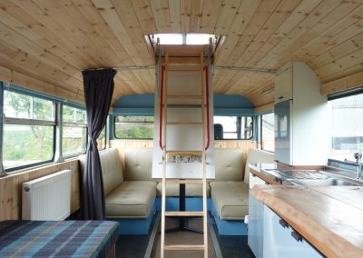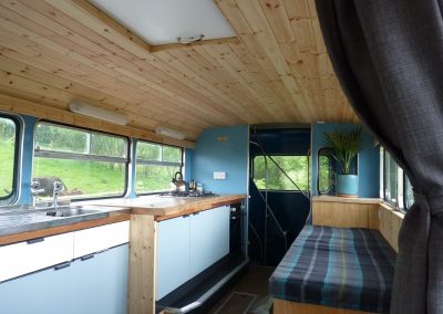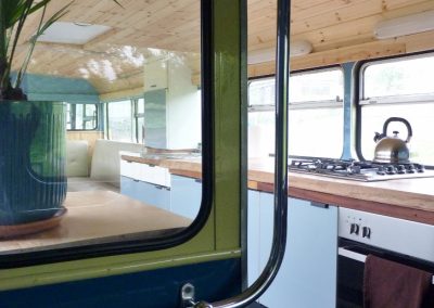 This bus has central heating, electricity, and a good-sized kitchen. There are two separate access double bedrooms upstairs with ensuite toilets. Behind the drivers’ cab, two single sofa beds can be utilised. So, the Bus can sleep a maximum of 6 people. The ‘Bus Stop’ at the rear of the bus has a toilet on the left, a shower in the centre, and another shower with a view on the right.